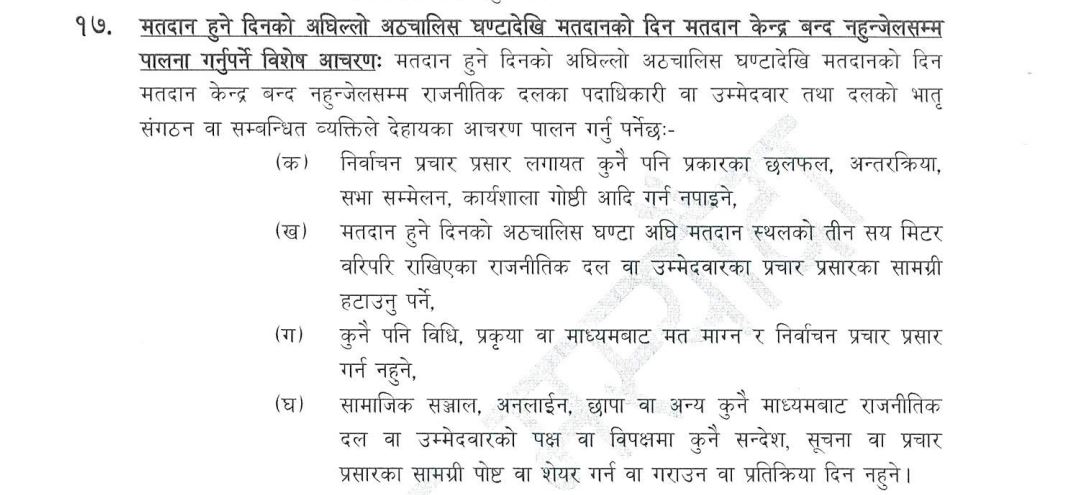 निर्वाचनको मौन अवधि: निर्वाचन आयोगले प्रचार–प्रसार र प्रभावकारी गतिविधि माथि लगाएको कडा प्रतिबन्ध